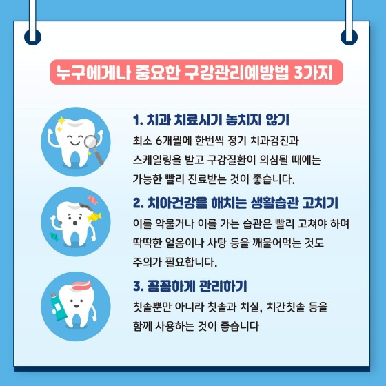 [1] 국가건강정보포털 - 구강병 예방 및 관리방법! 알려드리겠습니다! (https://health.kdca.go.kr/healthinfo/biz/health/gnrlzHealthInfo/gnrlzHealthInfo/gnrlzHealthInfoView.do?cntnts_sn=6291)