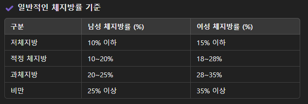- 체지방률 : 일반적으로 남성은 10-20%, 여성은 20-30%가 적정 범위로 여겨져요.