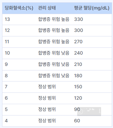 위의 표를 참고하시면, 당화혈색소 수치에 따른 관리 상태와 평균 혈당 수치를 확인하실 수 있습니다. 예를 들어, 당화혈색소 수치가 6%인 경우 평균 혈당 수치는 120mg/dL이며, 당화혈색소 수치가 1%씩 증가하면 평균 혈당 수치는 30mg/dL씩 증가하고, 반대로 감소하면 30mg/dL씩 감소합니다.