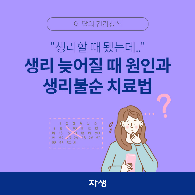 [2] 자생한방병원 - "생리할 때 됐는데.." 생리 늦어질 때 원인과 생리불순 치료법 (https://m.jaseng.co.kr/etc/healthInfoView.asp?idx=1157&Location_Branch_Code=10014)