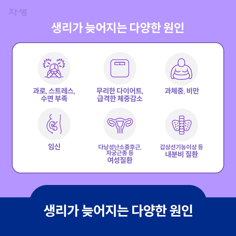 - 스트레스 : 정신적, 정서적 스트레스는 호르몬 균형을 깨뜨려 생리를 늦출 수 있습니다.