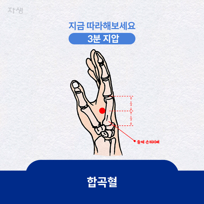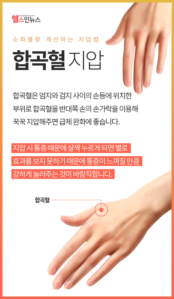 합곡혈은 손의 엄지와 검지 사이에 위치해요. 이곳을 약 3분간 지압하면 소화에 도움이 됩니다.
