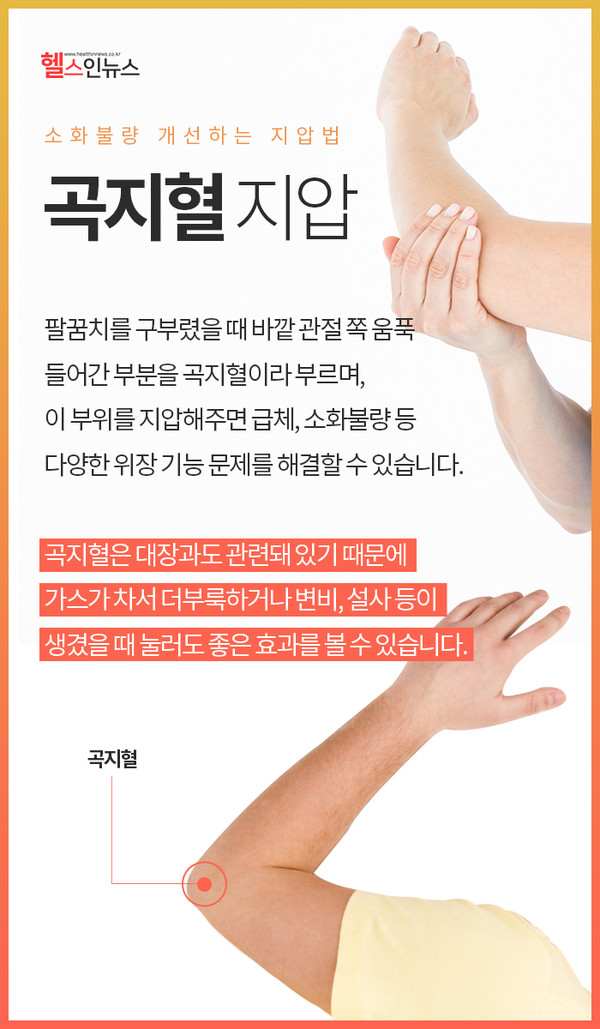 곡지혈은 팔꿈치 안쪽으로, 이곳을 눌러주면 소화와 관련된 여러 기능을 개선할 수 있습니다.